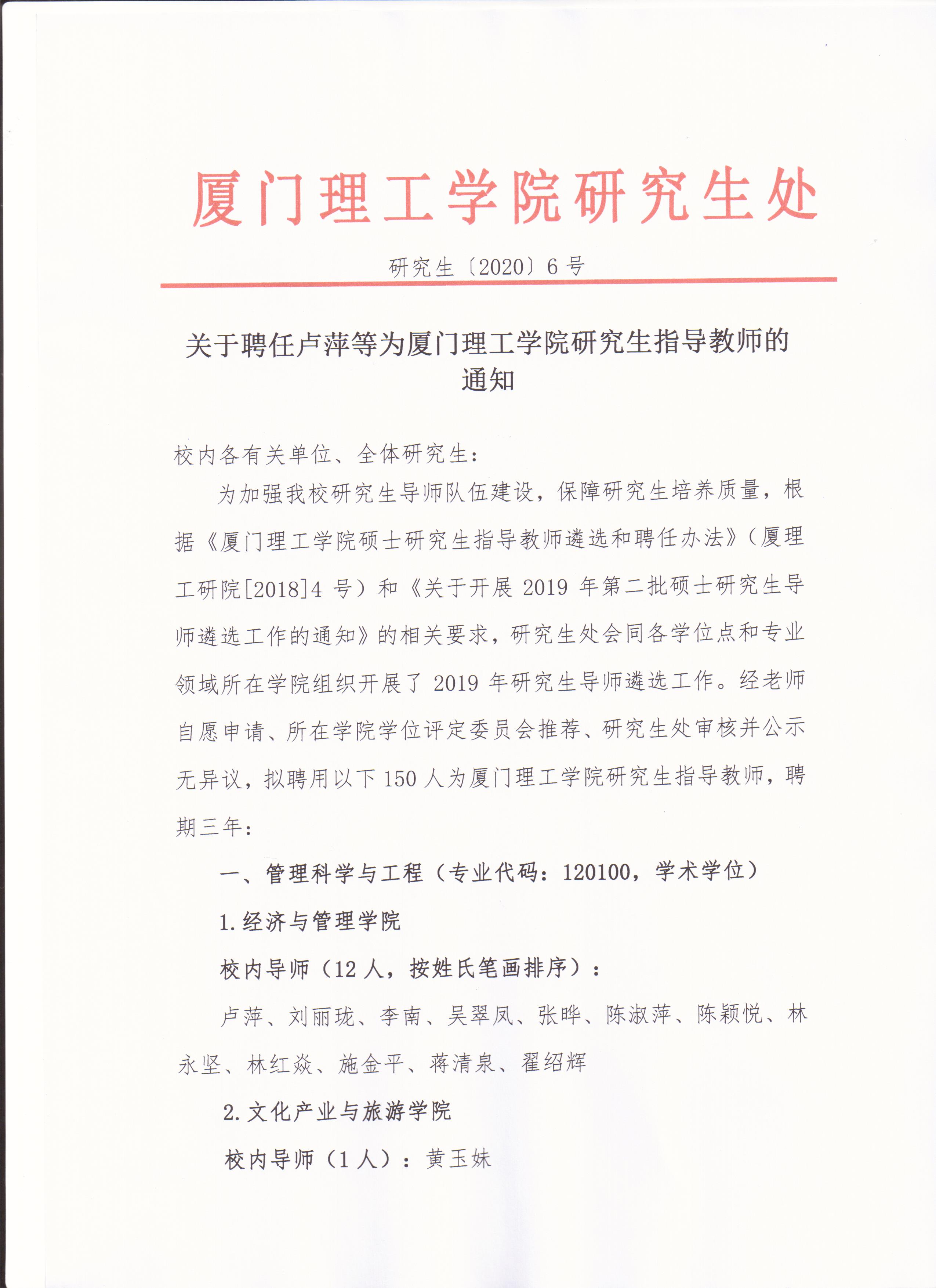 关于聘任卢萍等为米兰官方注册研究生指导教师的通知